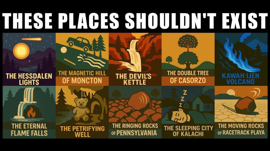 00:00 - The Hessdalen Lights: A Valley That Breathes Fire 03:58 - The Magnetic Hill: Where Gravity Fails 07:22 - The Devil's Kettle: The Vanishing River 11:08 - The Double Tree of Casorzo: A Botanical Impossibility 13:56 - Kawah Ijen: The Volcano with Blue Lava 16:55 - The Eternal Flame Falls: Where Fire and Water Coexist 20:05 - The Petrifying Well: Turning Objects to Stone 22:59 - The Ringing Rocks: A Symphony of Stone 25:46 - The Sleeping Sickness of Kalachi: A Cold War Ghost 28:53 - The Sailing Stones of Racetrack Playa: The Rocks That Move Themselves